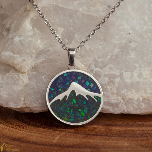 Mountain Range Round Stainless Steel Pendant Necklace - Opal Gemstone Jewelry - Gift for Him - Gift for Her